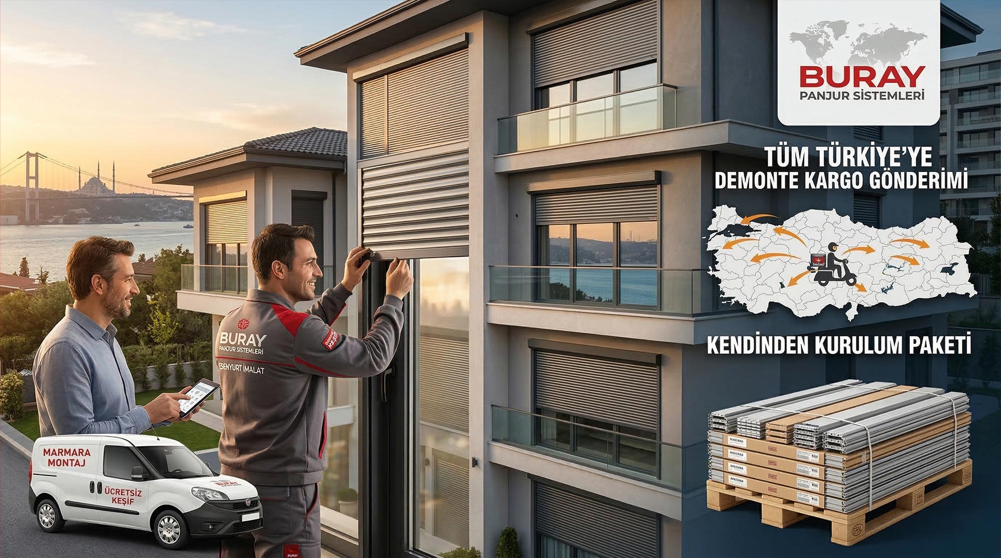 Tüm Türkiye: Marmara Bölgesi dışındaki müşterilerimiz için sınırları ortadan kaldırıyoruz. İstediğiniz ölçü ve özelliklerdeki kepenk ve panjur sistemlerini, motor ve bağlantı aparatlarıyla birlikte kuruluma hazır (demonte) şekilde güvenli kargo ile Türkiye’nin dört bir yanına ulaştırıyoruz.
